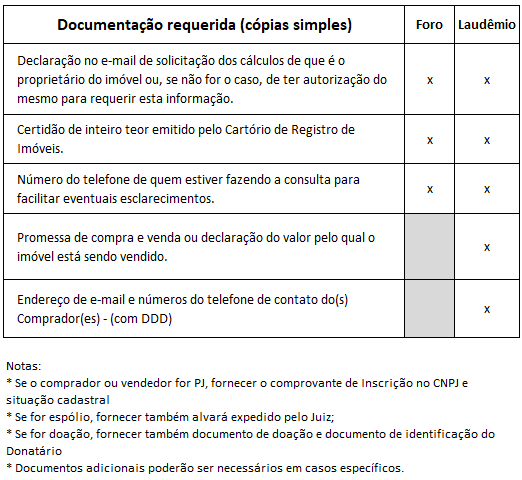 III - Documentação a ser encaminhada por e-mail, para os cálculos do Foro e/ou Laudêmio (casos típicos):